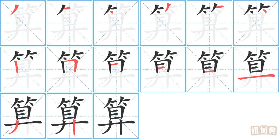 笔顺说明:此字《说文解字》篆形作「」,数也。从竹,从具。楷书写法:「」下,上作「目」,下作「廾」。若为上偏旁,如「篡」、「纂」、「篹」等字,则末二笔改撇、捺,捺笔上不出头